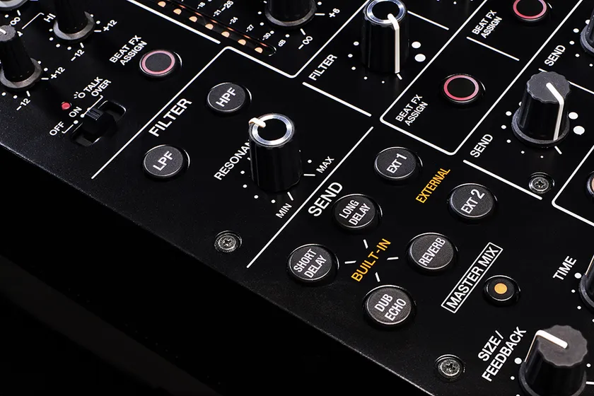 『DJM-V10』は、LPF(LOW PASS FILTER)とHPF(HIGH PASS FILTER)の切り替えが可能なFILTER専用のノブを各チャンネルに搭載したことにより、確実な操作でダイナミックに音を変化させることができます。さらにSENDノブの搭載により、各チャンネルの音を本機に内蔵されたDelayやReverbなどの残響系エフェクトや、外部に接続されたエフェクターなどへ送ることで、様々なエフェクターを駆使した独創的なパフォーマンスを直感的に実現できます。