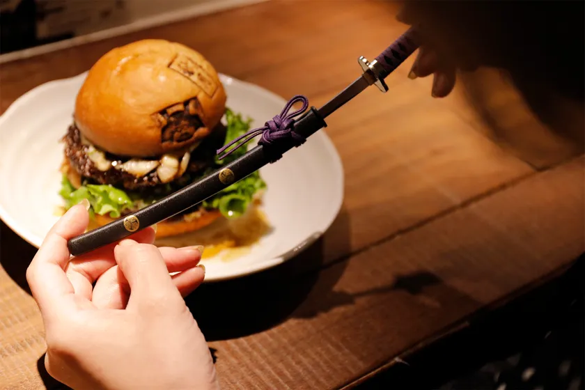 バーガーピックとして提供する、精巧に作られた織田信長モチーフの名刀ナイフはインパクト大です。