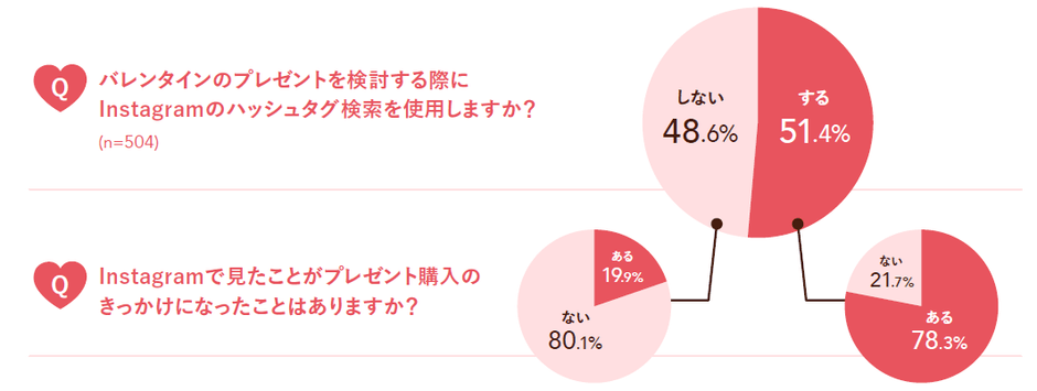 プレゼントを渡すと答えた人に「プレゼントを検討する時にInstagramのハッシュタグ検索を使用するか」について聞いたところ、51.4%が「使用する」と回答しました。さらに、プレゼントを検討する際にハッシュタグ検索をした人のうち、実際にプレゼントを購入した人は78.3%となった一方でプレゼントを検討する際にハッシュタグ検索をしない人の購入率は19.9%にとどまりました。このことから、ハッシュタグ検索を使用して商品を検討した人は、そのハッシュタグ検索の結果がきっかけで購入に至る傾向があることがわかりました。