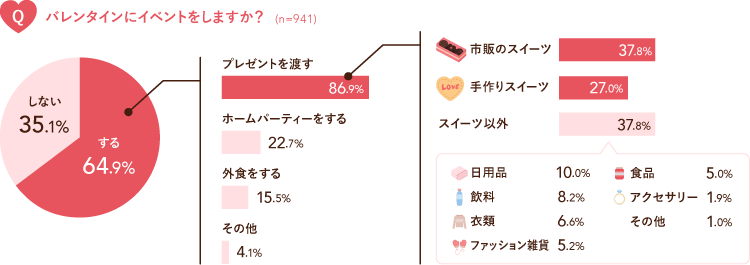 バレンタインに何かしらのイベントをすると答えた人のうち、86.9%が「プレゼントを渡す」と回答しました。また、「プレゼントの内容」について聞いたところ、37.8%が市販のスイーツを購入すると回答し、手作りスイーツを上回りました。また、37.8%が日用品や飲料、衣類などの「スイーツ以外のプレゼント」を渡すと回答し、スイーツ以外の品物がバレンタインプレゼントでも一般的になっていることが明らかとなりました。