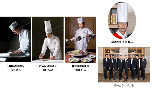 昨年9月、日本では初の「G20消費者政策国際会合」が当ホテルで開催された際、各国の関係者を料理でもてなした調理長による賞味会です。総調理長 貞元 賢二(さだもと けんじ)監修のもと、日本料理調理長 宮川 直人(みやかわ なおと)、西洋料理調理長 原田 修児(はらだ しゅうじ)、中国料理調理長 齋藤 仁彦(さいとう きみひこ)の3人が腕をふるい贅をつくした、ホテルならではの和洋中のディナーコースを楽しむことができる機会です。また、ソムリエやレストランサービスの国家検定であるHRS技能検定1級の資格をもったスタッフ「チームクレメント」による熟練のサービスで至高のおもてなしを堪能していただけます。