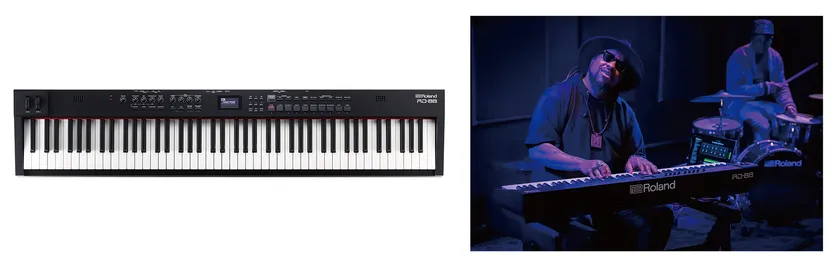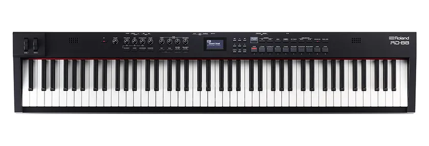 『RD-88』は、繊細なタッチの違いにもスムーズに対応し自然な音色変化や減衰音まで実現するアコースティック・ピアノ・サウンドや、表現力豊かで迫力のあるエレクトリック・ピアノ・サウンド、自然な演奏感を実現するハンマー・アクション構造のピアノ鍵盤を搭載。音色をすばやく選択できるボタンや、演奏する会場に合わせて音量や音質、エフェクトを即座に調整できるつまみなど、ステージ演奏に最適な操作性も備えています。