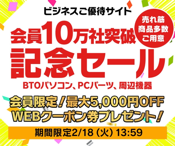 ビジネスご優待会員サイトご登録10万社突破を記念し、当社おすすめのBTOパソコンをはじめ、担当バイヤーが厳選したPCパーツ・周辺機器を特別価格でご用意しました。ビジネスご優待会員様に最大5,000円分のWEBクーポン券を配布いたします。