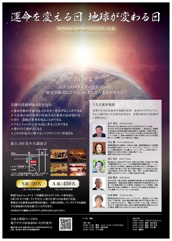 株式会社高次元宇宙波動研究所は、5名の先進的な精神世界を語る大家による講演会「運命を変える日 地球が変わる日」を台東区のダンスホール新世紀にて2020年3月8日(日)に開催します。