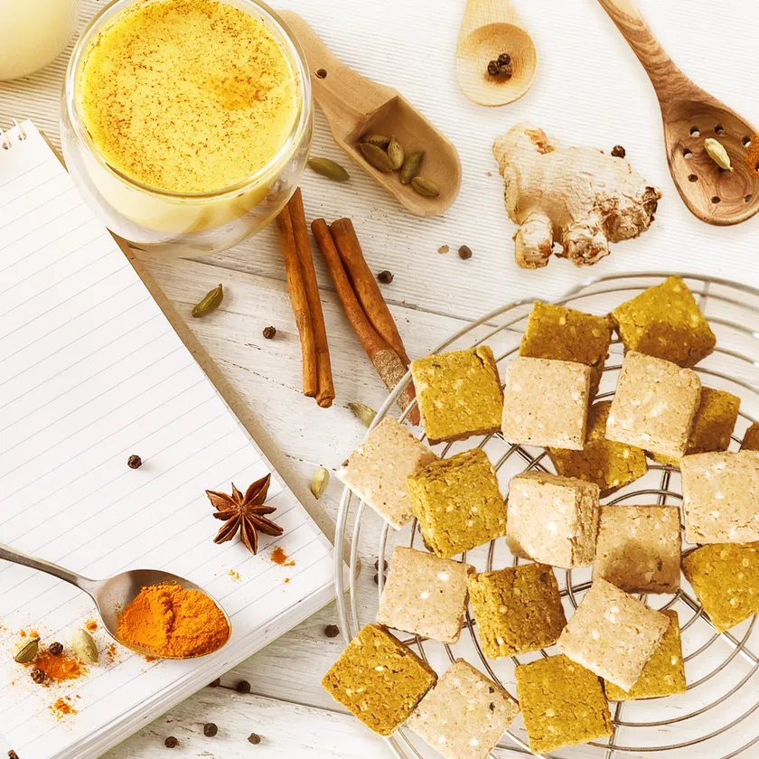 ターメリックは抗酸化、抗炎症作用が高く免疫力の強化も期待できるアユルヴェーダのオールスター的なスパイス。そのターメリックの摂り入れ方として近年注目されているのが牛乳にジンジャーとターメリックを混ぜた“ターメリックラテ”と呼ばれるドリンク。欧米の健康意識の高いカフェでの定番メニューとなっています。でももっと手軽に“ターメリックラテ”を味わえたら!と思い考案したのがこのクッキー。ラテといっても、牛乳の代わりにココナッツミルクパウダーを使用。黄金色のポリフェノール「クルクミン」を美味しく摂れ、シナモン、カルダモン、ナツメグといったスパイスをたっぷり感じる大人な味わいです。