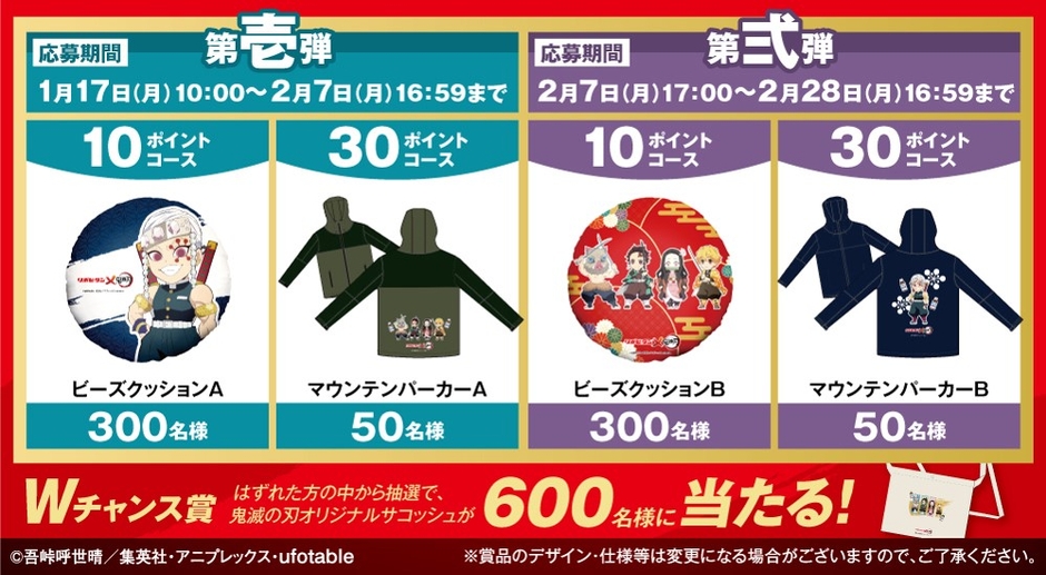 リポビタンの会員サイト、リポビタンポイントチャージステーションで、シリアルナンバーを登録して応募すると、ポイント数に応じて、アニメ「鬼滅の刃」のキャラクターが描かれたビーズクッションやマウンテンパーカーなど、オリジナルグッズが抽選で合計1,300名様に当たります