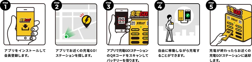 「充電GO!」は、“いつでも充電、どこでも充電”をコンセプトにしたモバイルバッテリーのレンタルサービスです。「充電GO!」専用のアプリで会員登録した後は、「充電GO!」ステーションでQRコードを読み取るだけで、簡単にバッテリーをレンタルすることができます。返却場所は別のステーションでも可能なため、自由に移動しながら充電をして、用事などを済ませた後は移動先で最寄りの「充電GO!」ステーションへ返すことができます。