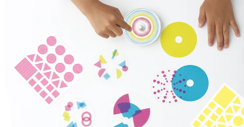 「とうめいカード」に、いろカードと同じ3色のシールを貼って自分のオリジナルカードがデザインできます。様々な形のシールを組み合わせて自由に模様を作ることで、子供たちの創造力を引き出します。自分で作ったカードを回し、オリジナルの色や見え方の変化を楽しめます。また、既存のカードと組み合わせることで更なる変化を楽しむことができ、子供たちの創作意欲を高めます。