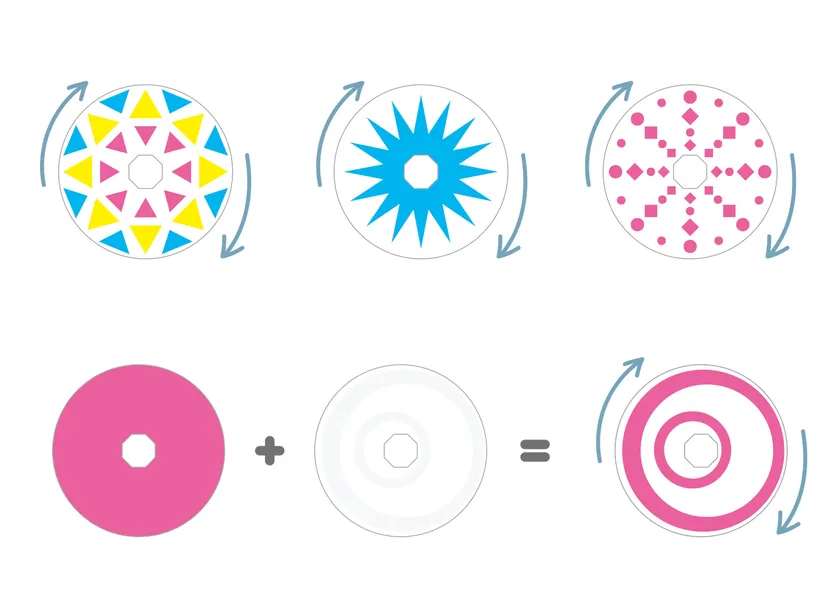 「もようカード」は回すことで形が変化します。また、「うごきカード」を重ねて回すと、模様が動いて見えます。他にも、コマの回転スピードによる見え方の変化など、いろいろなコマの様子を観察して楽しむことができます。