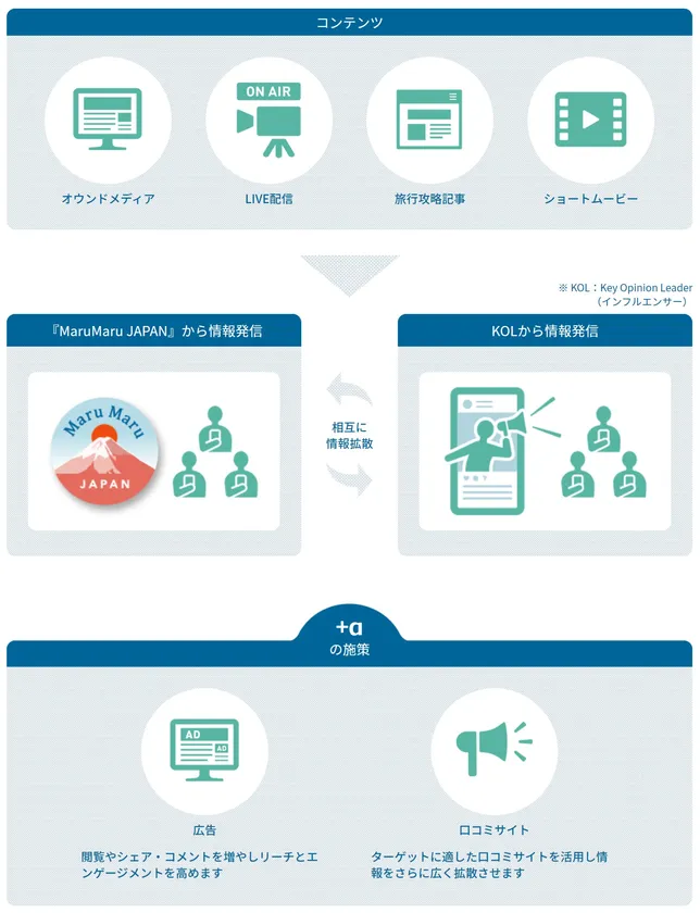 『MaruMaru JAPAN (まるまるジャパン)』として運営するSNSアカウントは、100万人を超えるフォロワーのWeiboをはじめ、東南アジア全域にリーチするFacebookなど、さまざまなSNSメディアでKOL(インフルエンサー)として訪日観光客にアプローチします。