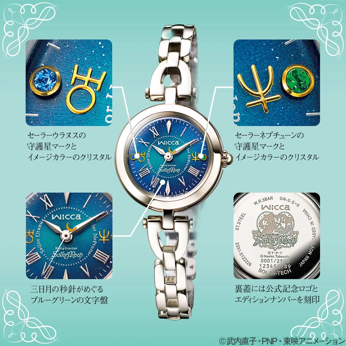 三日月の秒針が時を刻むブルーとグリーンのグラデーションの文字盤。3時と9時の位置には、セーラーウラヌスとセーラーネプチューンそれぞれの守護星マークと、ダークブルーとエメラルドグリーンのスワロフスキー(R)・クリスタルが配されています。