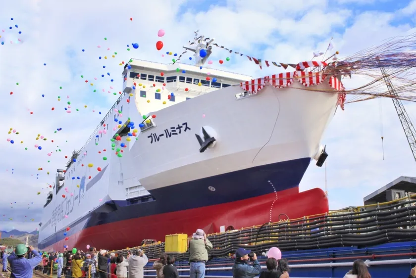 2020年1月9日(木)、内海造船株式会社の瀬戸田工場において、ブルールミナスの命名式及び進水式が執り行われました。進水式とは、船が生まれて初めて海に浮かぶ瞬間であり、船としての誕生を祝い、航海の無事を祈る式典です。完成後の6月の就航に向け、船内設備等、現在も順調に工事が進んでいます。
