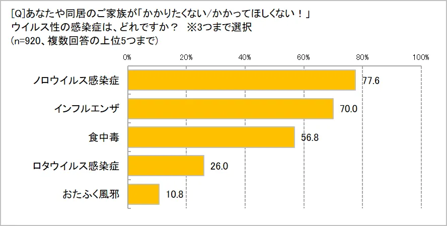 「かかりたくない」のはノロウイルス感染症77.6%、インフルエンザ70.0%を上回る