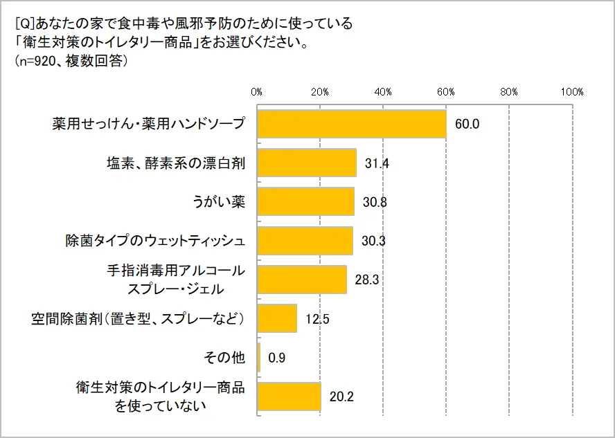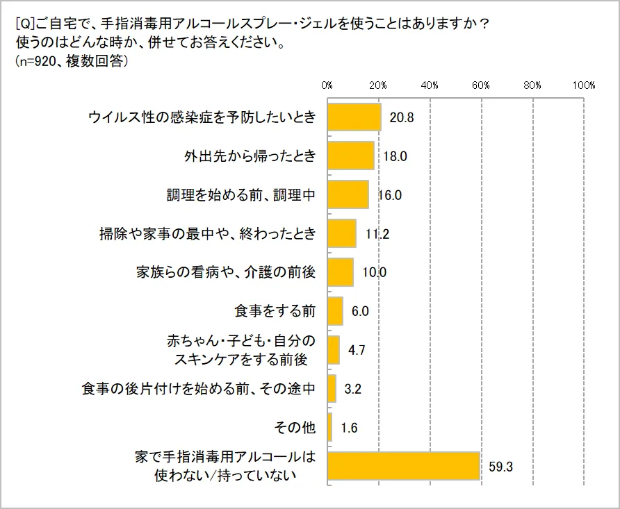 「自宅で手指消毒用アルコールスプレー・ジェルを使うときはどんなときですか?」という問いに対しても「使わない/持っていない」が59.3%。ただし、「使う」と答えた人のその目的は「ウイルス性の感染症を予防したいとき」20.8%でした。