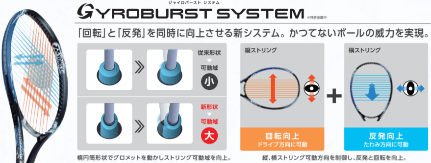本シリーズには新構造「GYROBURST SYSTEM(ジャイロバーストシステム)」※1を採用。グロメット筒を楕円形状にすることでストリングの可動域を拡大させながら、縦ストリングがドライブ方向(左右)、横ストリングがたわみ方向(前後)に動くように制御することで、回転と反発を同時に向上させ、ボールの威力を生みます。