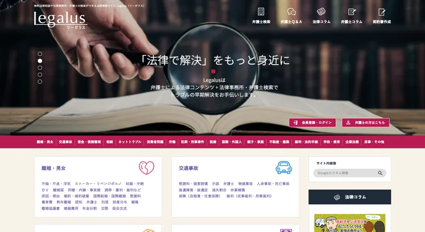 2001年以来、法律情報ポータルサイトとして運営されてきた「法、納得!どっとこむ」が2016年11月1日に「Legalus(リーガラス)」として、新たに生まれ変わりました。弁護士Q&A、法律コラム、弁護士コラム、弁護士事務所・弁護士検索、契約書作成など豊富なコンテンツと便利な機能を備えており、年間800万人以上ユーザーが訪問しています。「法律で解決」をもっと身近に、をテーマにユーザーの悩みを解決するため、ITやAIを活用した様々サービスやコンテンツを提供しています。