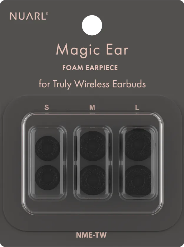 「Magic Ear」フォームイヤーピースは、フォームタイプ・イヤーピースの遮音性とシリコンタイプ・イヤーピースの利便性を兼ね備えたNUARL独自のイヤーピースです。このたびNUARLの完全ワイヤレスイヤホンをご使用のお客様からのご要望に応え、完全ワイヤレスイヤホン専用タイプをご用意いたしました。
