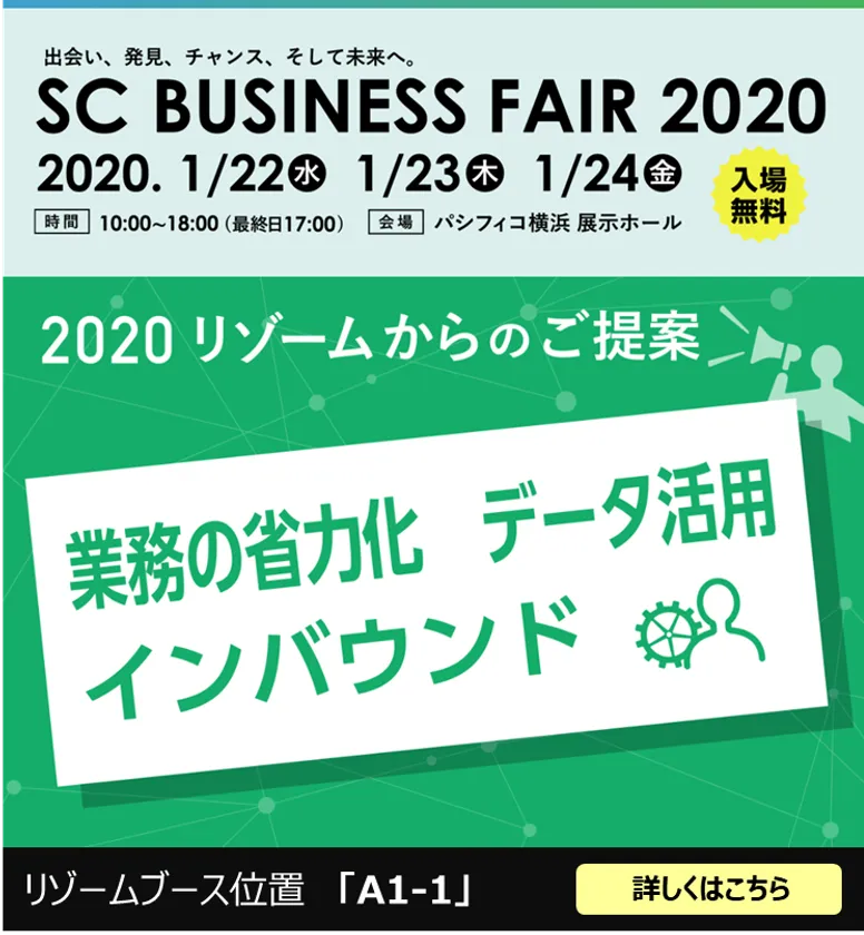 株式会社リゾーム(本社:岡山県岡山市、代表取締役:中山 博光、以下 当社)は、1月22日(水)から24日(金)にパシフィコ横浜(神奈川県横浜市)で開催されるSC業界唯一の商談展示会「第44回SCビジネスフェア2020」(主催:一般社団法人日本ショッピングセンター協会)に出展いたします。