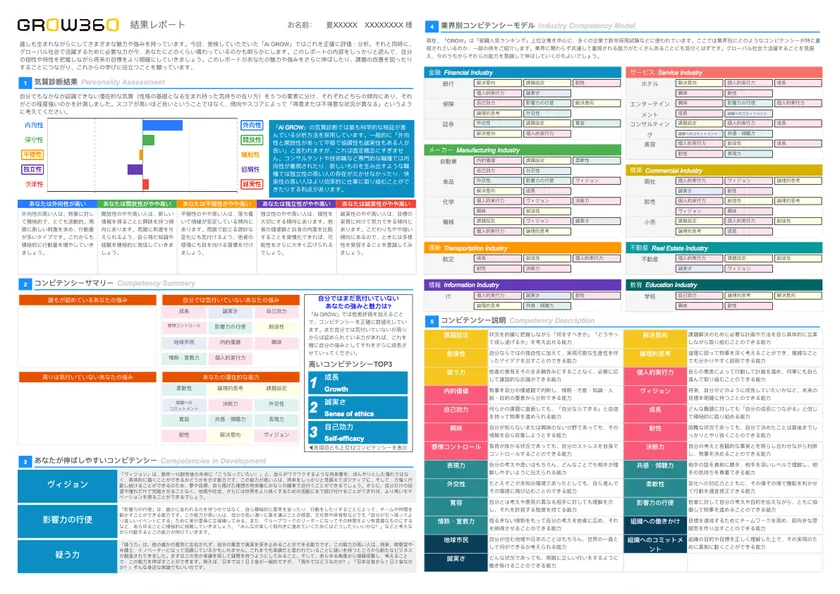 『GROW360』は、360度コンピテンシー評価とBIG5(※1)とIAT(潜在連合テスト)(※2)、2つのアカデミックな知見を取り入れた気質診断(国際特許取得済)の結果を基に人工知能が評価を補正・分析する評価ツールです。