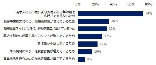 ミドルを対象とした求人募集の変化について伺ったところ、転職コンサルタントの66%が「増加」と回答しました。理由を伺うと、「若手人材の不足により採用人材の年齢幅を広げざるを得ないため」(74%)が最多でした。