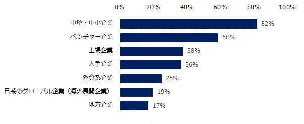 ミドルを対象とした求人のトレンドについて伺うと、企業タイプでは「中堅・中小企業」(82%)が最多でした。回答した転職コンサルタントからは「冠企業以外の中堅・中小企業は知名度に加え、安定性で若手が集まらない傾向があり、採用活動に苦戦が続いている」、「中堅・中小企業には成長の余地が十分にある。今後、成長スピードの加速に合わせて、即戦力のニーズが高まると思う」、「組織づくりを行なっている企業が非常に多い」という声が挙がりました。