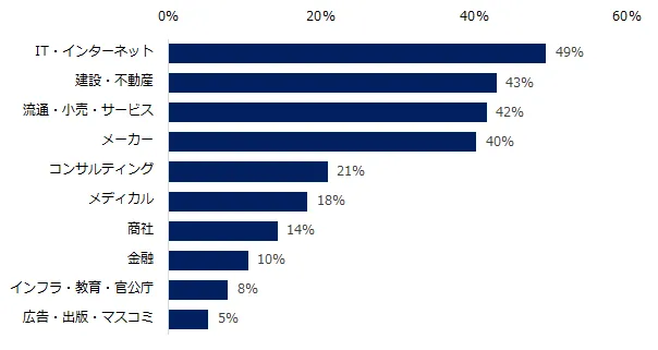 業種では「IT・インターネット」(49%)が最多でした。「新しいビジネスが生まれやすい業界だから」、「市場成長率が高く幅広い職種での増員が見込まれている」といった点が理由として寄せられました。