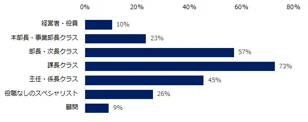 役職では「課長クラス」(73%)が最多でした。「実務経験があり、マネジメント力ある課長~部長クラスの引き合いが強い」、「就職氷河期と言われる時期に採用を控えていたツケが今になって出てきており、管理職を任せたい世代が不足している」という声が挙がりました。この他、職種や年収のトレンドを伺っています。