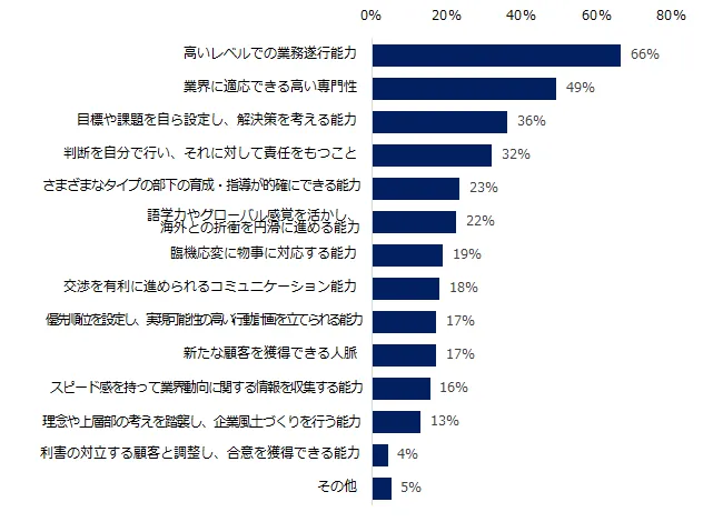 採用企業がミドルに求めるスキルについて伺うと、「高いレベルでの業務遂行能力」(66%)が最多でした。「ミドル=高年収に期待しているスキルは即戦力。一人で業務を全て遂行できる能力が基本」、「即戦力を求めているため、すぐに業務に取り組めることや自走できる能力と経験、該当する資格や技術を求められる」、「自身で結果を出すことができる人」という声が挙がりました。