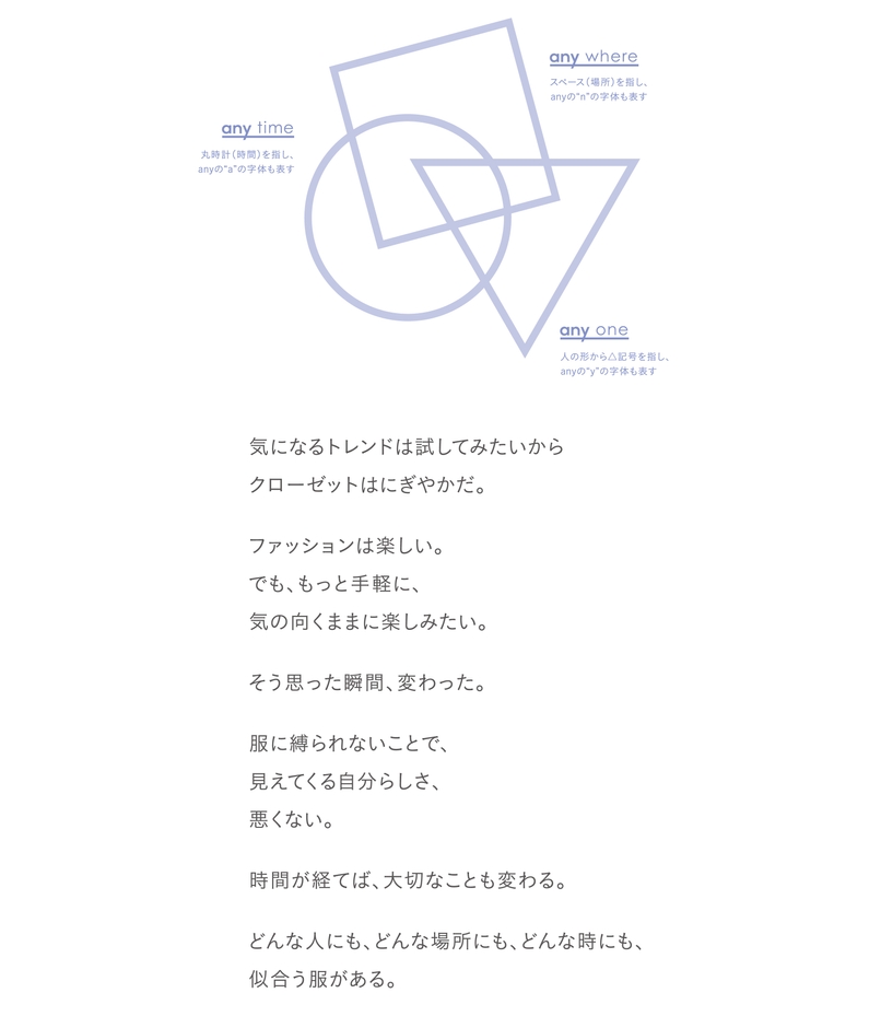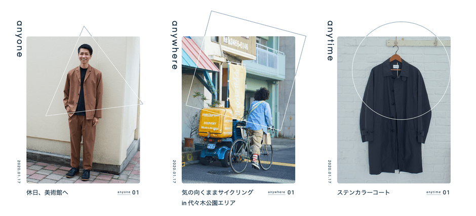 2020年1月17日(金)12:00よりオープンするブランドサイトは、“どんな人にも、どんな場所にも、どんな時にも 似合う服”というコンセプトの元、24時間変わり続けるムービー”anytime movie”や、各界の著名人やスタッフなど様々な人、お気に入りの場所、こだわりの物、などに焦点を当てた連載コンテンツページで訪れる度に変化を楽しめる仕掛けとなっており従来のブランドサイトとは全く違った見え方となっています。