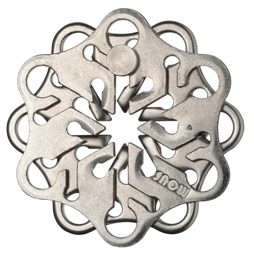 『はずる キャストスノー』は、金属製立体パズル『はずる』シリーズの最新作で、香港のパズルデザイナー、Kyoo Wong氏による、雪の結晶のような六角形の2つのピースが重なって絡み合う美しいデザインになっています。
