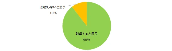コミュニケーション能力は現在の仕事に影響するかを伺うと、90%が「影響すると思う」と回答しました。