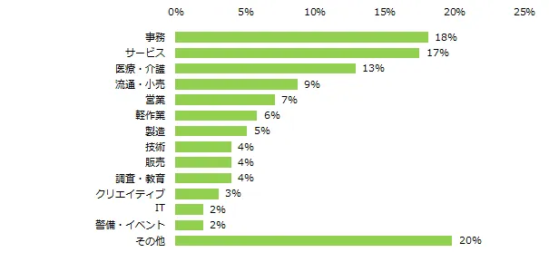 「コミュニケーション能力は現在の仕事に影響すると思う」と回答した方の具体的な仕事を伺うと、トップ3は「事務」(18%)、「サービス」(17%)、「医療・介護」(13%)でした。「その他」(20%)には、「スポーツトレーナー」「コールセンター」「美容師」など、様々な職業が含まれました。
