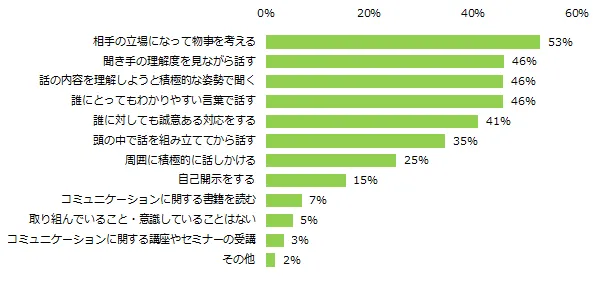 コミュニケーション能力向上のため、取り組みや意識していることを伺ったところ、「相手の立場になって物事を考える」(53%)が最多でした。次いで、同率(46%)で「聞き手の理解度を見ながら話す」、 「話の内容を理解しようと積極的な姿勢で聞く」、 「誰にとってもわかりやすい言葉で話す」となりました。