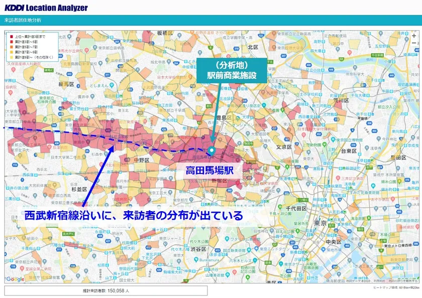 KDDI Location Analyzerの来訪者居住地分析機能を用いて、高田馬場駅前にある某商業施設(以下、施設A)に来た人の推定居住地を地図上に表示させ分析しました。