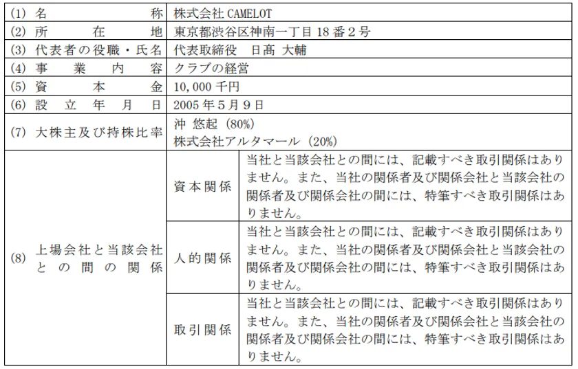 CAMELOT社は2005年に設立され、JR渋谷駅から徒歩5分にある場所にて『CLUB CAMELOT』というナイトクラブを運営しております。CLUB CAMELOTは地下1階から地下3階までの3フロアで約326坪の広さを有する大型店舗で、繁盛日にあたっては一日あたり約2,000人超が来場するなど、日本屈指の動員数を誇るナイトクラブです。