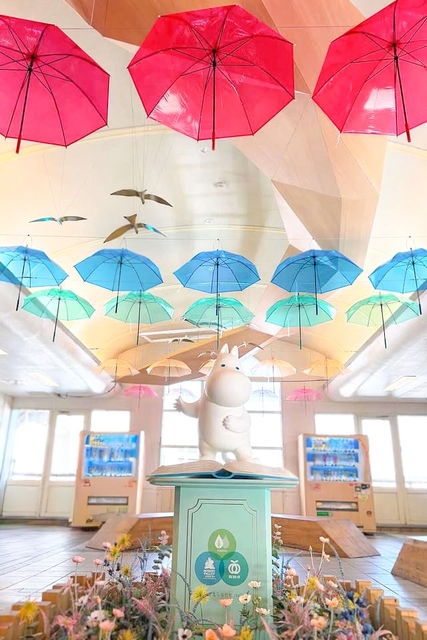 上空には、『ムーミン谷の彗星』に登場するムーミン谷の仲間たちのキャラクターパネルのバルーンがカラフルなアンブレラの中に登場し、ワクワクするようなフォトジェニックな空間を演出します。