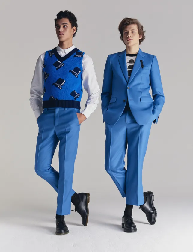 今シーズンは新鮮なアクセントカラー「ウィンターブルー」をフィーチャーし、鮮やかな色使いをクラシックな男性らしい色調に溶け込ませています。タキシードジャケットを切りっぱなしの仕上げにしたり、シャツにアシンメトリーなパッチワークをあしらうなど、クラシックでダンディなアイテムに意外なひねりを利かせています。コレクションはシャツやニットからフォーマルウェア、アウター、アクセサリーまで全部で約130点。