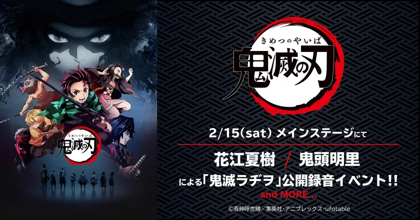 アニメ「鬼滅の刃」のイベントが開催決定。ステージでは本作のメインキャストによる「鬼滅ラヂヲ」公開録音特別版をお届けします。主人公・竈門炭治郎役の「花江夏樹」、主人公の妹である竈門禰豆子役の「鬼頭明里」が登場。
