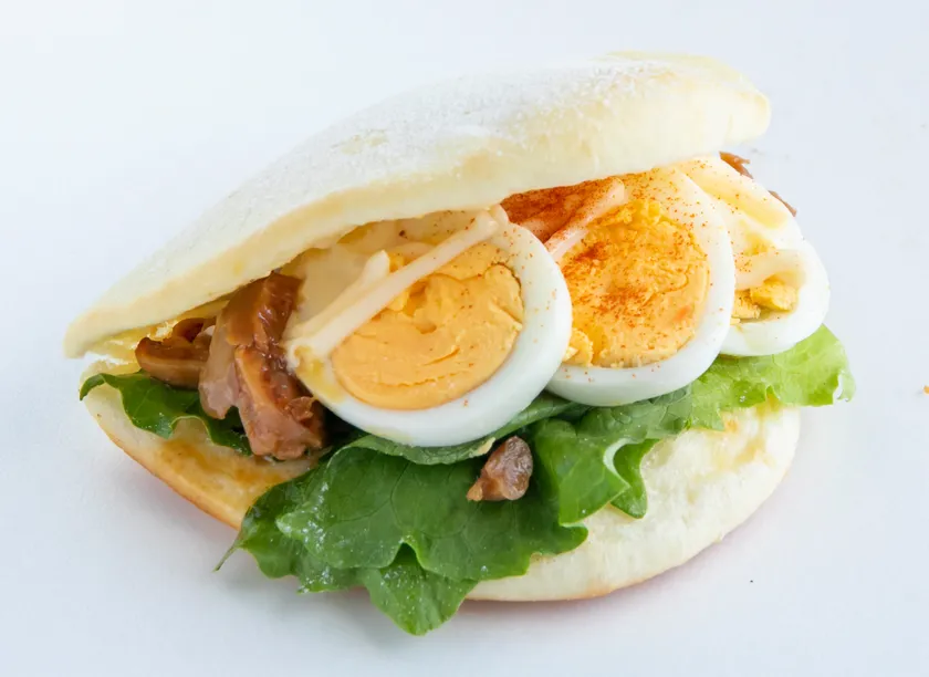 もっちりとしたパン生地に甘辛の照り焼きチキンと卵をサンド。