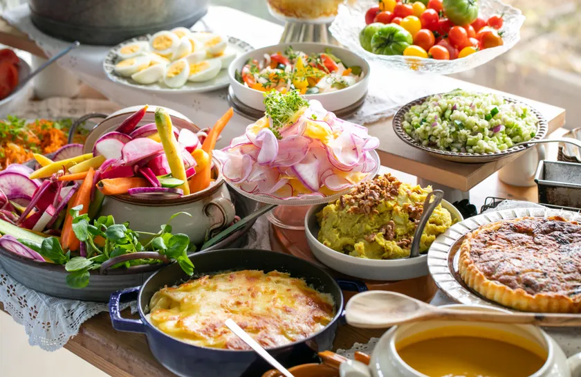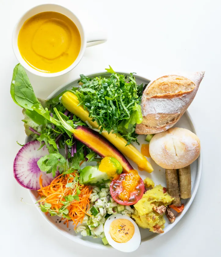 90分食べ放題のサラダビュッフェとお好きなパン2つを選べる「サラダビュッフェランチ」にプレートを付けることもできます。また、当店自慢のサラダビュッフェは、サラダ、季節野菜のマリネ、ピクルス、エッグキッシュ、ラタトゥイユ、ジャガイモのグラタン、野菜ポタージュなどバラエティに富んだ野菜料理をご用意しています。