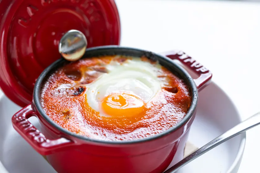まるで鳥の巣!?クレープの下にはぷるぷる大きな卵型プリン。中には卵黄ソースがたっぷり!