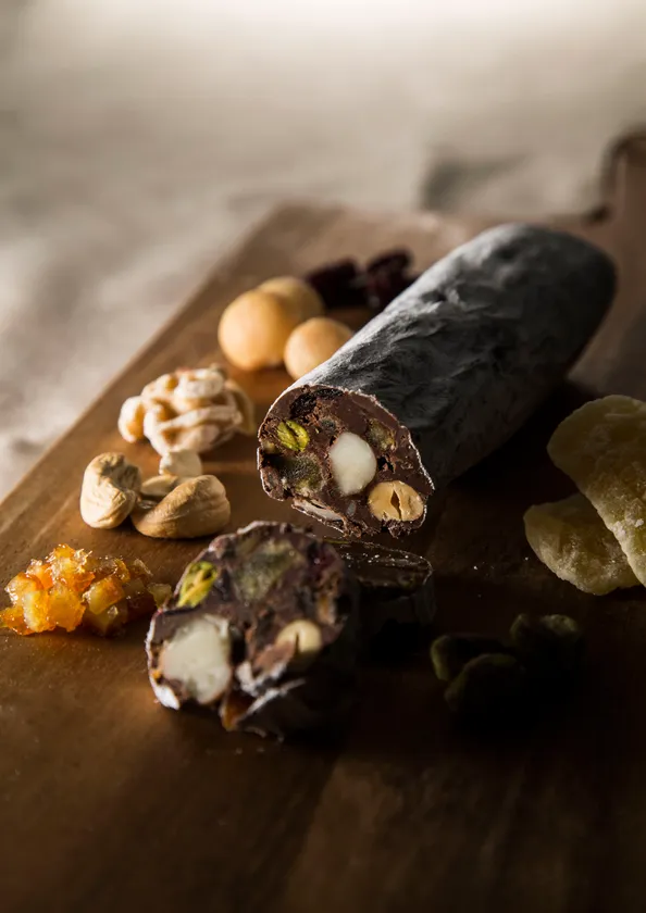 ソシソンとは、フランス語でサラミを意味します。チョコレートサラミとも呼ばれ、濃厚なガナッシュの中に、ナッツ、ドライフルーツがたっぷり入った大人のチョコレートです。