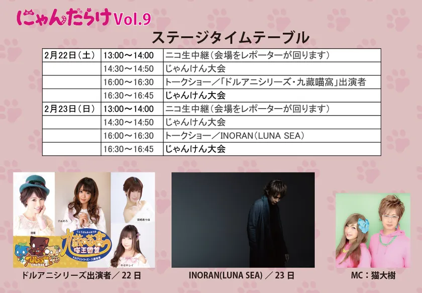 イートインコーナー・にゃんカフェの隣にあるステージでは、じゃんけん大会やトークショーが行われます。22日(土)16:00からは「ドルアニシリーズ・九藏猫窩」出演者、23日(日)16:00からは結成30周年を迎えてニューアルバム「CROSS」をリリース、全国ツアーを控えるロックバンドLUNA SEAのギタリストINORANが登壇。たっぷりと猫愛を語ってくれます。