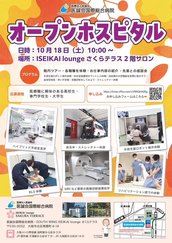 医療法人医誠会(本社:大阪市北区、代表者:谷 幸治)医誠会国際総合病院は、2025年10月18日(土)、医療職を志す高校生・専門学校生・大学生を対象に第1回オープンホスピタルを開催します。病院バックヤードの見学や手術支援ロボット「ダビンチ」の操作体験、救急車・ストレッチャー体験などを通じて、学生が医療現場のリアルに触れる機会を提供します。
