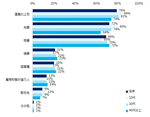 年代別に見ると、20代は他の年代に比べ、「直属の上司」(84%)、「先輩」(80%)との人間関係に不安を感じているようです。