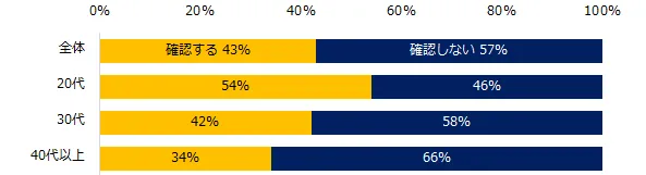 「転職をする際、事前に転職先の人間関係を確認しますか?」と伺ったところ、43%が「確認する」と回答。年代別にみると、20代は他の年代に比べ、「確認する」と回答した方の割合が多く、半数を超えました。