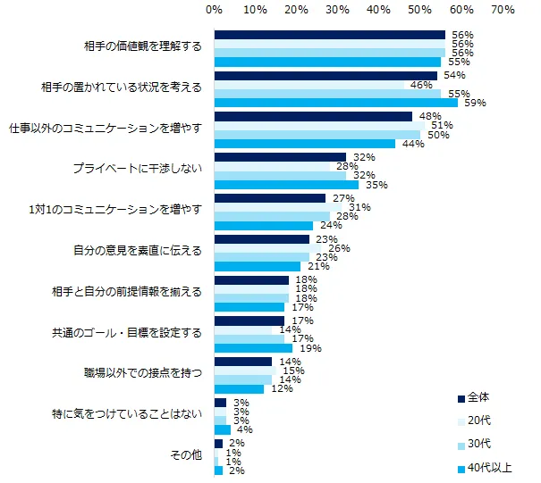 第3位は「仕事以外のコミュニケーションを増やす」(48%)です。「相手との距離を縮めるため、業務に支障がない範囲で雑談をするようにしている」(25歳男性)、「雑談から話しやすい雰囲気作りを心がけていくことで、仕事上の報告・連絡・相談がスムーズにできると思う」(28歳女性)という声があがっています。