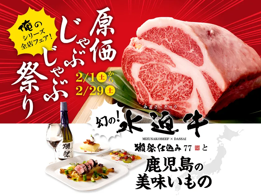俺のシリーズ全店で開催!「俺の原価じゃぶじゃぶ祭り ~水迫牛 獺祭仕込み77と鹿児島の美味いもの~」 2月1日(土)~2月29日(土)の期間限定!