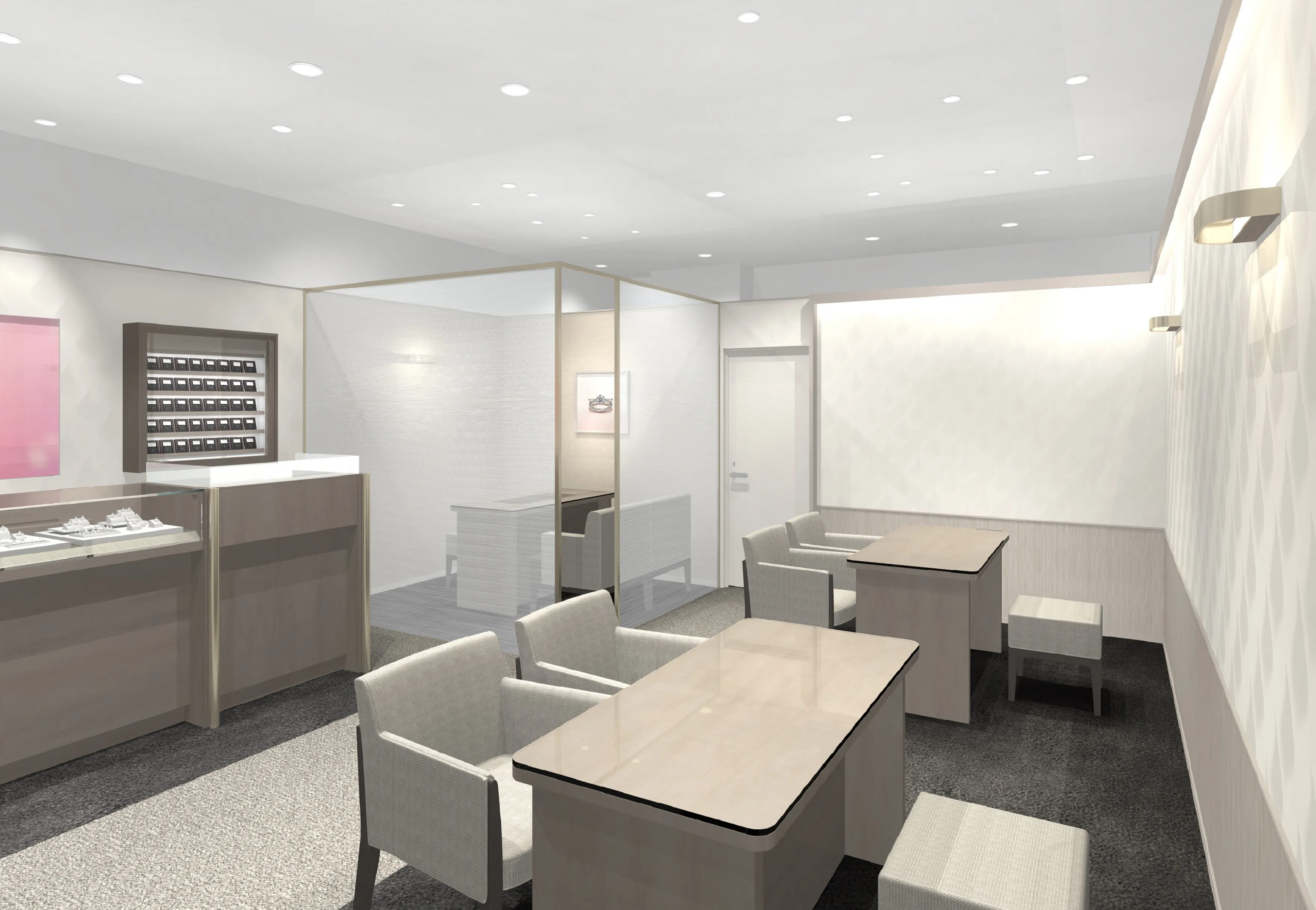 出店をする「近鉄百貨店」は、JR草津駅より徒歩1分の立地であり、高い集客力を誇る百貨店です。周囲にはブライダルジュエリーの競合店や結婚式場が集中しており、ブライダルジュエリーを探すお客様による買い回り効果も期待されています。またJR草津駅周辺の再開発も計画されており、今後ますます発展が見込まれているエリアです。ゆったりとした店内には、お客様の声を反映したプライベートブースも設置しており、一生に一度のお買い物に相応しい落ち着いた接客空間を実現しています。