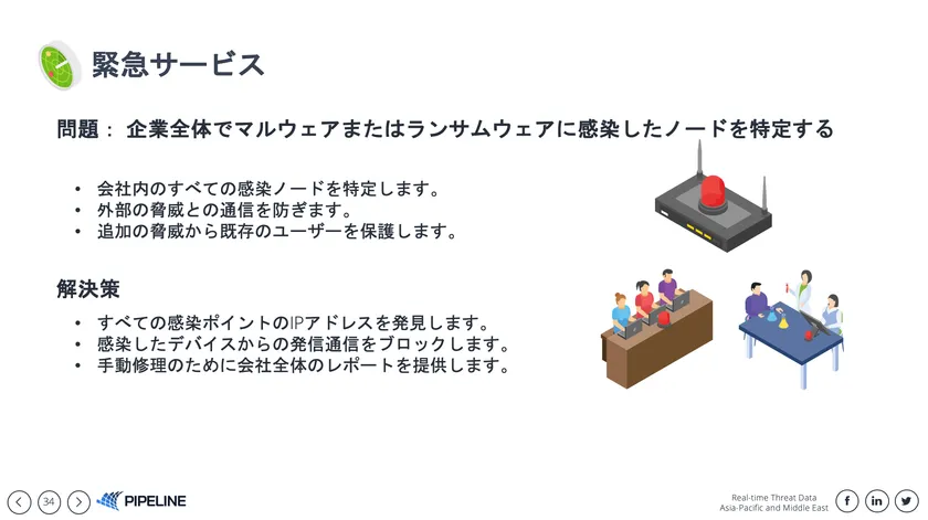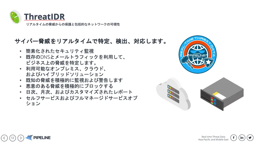 私どもPIPELINEブースでは、ThreatIDRをはじめ、サイバー攻撃対策をリアルタイムで特定、検出、対応サービスを発表いたします。ThreatIDRのリアルタイム脅威検出エンジンとインシデントマネジメント、インシデントハンドリング、検知後のトリアージ、レスポンスサポート。緊急マルウェア・ランサムウェア対策の検出と通信保護のサポートサービスも提供始めます。